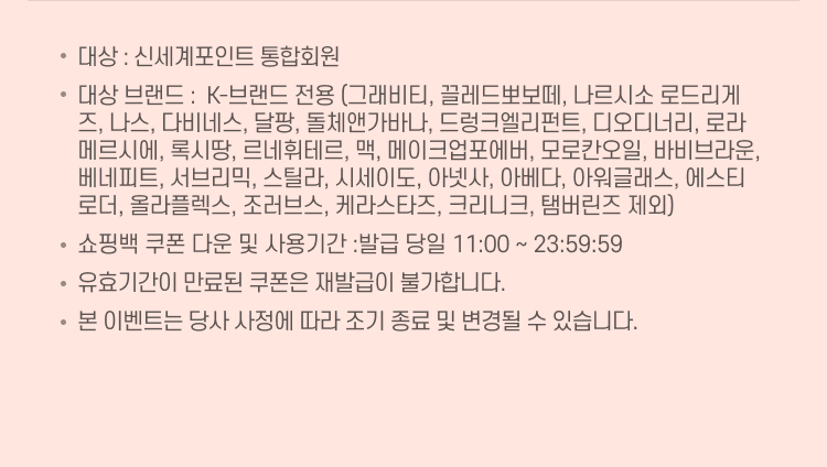 - 대상 브랜드 : K-브랜드 전용 (그래비티, 끌레드뽀보떼, 나르시소 로드리게즈, 나스, 다비네스, 달팡, 돌체앤가바나, 드렁크엘리펀트, 디오디너리, 로라메르시에, 록시땅, 르네휘테르, 맥, 메이크업포에버, 모로칸오일, 바비브라운, 베네피트, 서브리믹, 스틸라, 시세이도, 아넷사, 아베다, 아워글래스, 에스티로더, 올라플렉스, 조러브스, 케라스타즈, 크리니크, 탬버린즈 제외)
