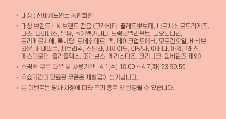 - 쇼핑백 쿠폰 다운 및 사용기간 : 4.1(수) 10:00 ~ 4.7(화) 23:59:59