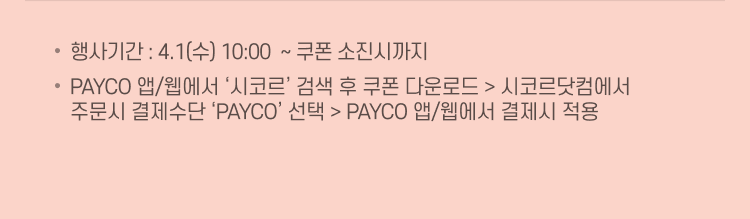 - PAYCO 앱/웹에서 ‘시코르’ 검색 후 쿠폰 다운로드 > 시코르닷컴에서 주문시 결제수단 ‘PAYCO’ 선택 > PAYCO 앱/웹에서 결제시 적용
