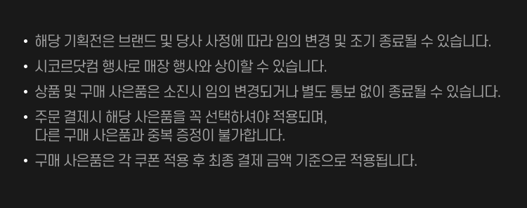 - 해당 기획전은 브랜드 및 당사 사정에 따라 임의 변경 및 조기 종료될 수 있습니다.